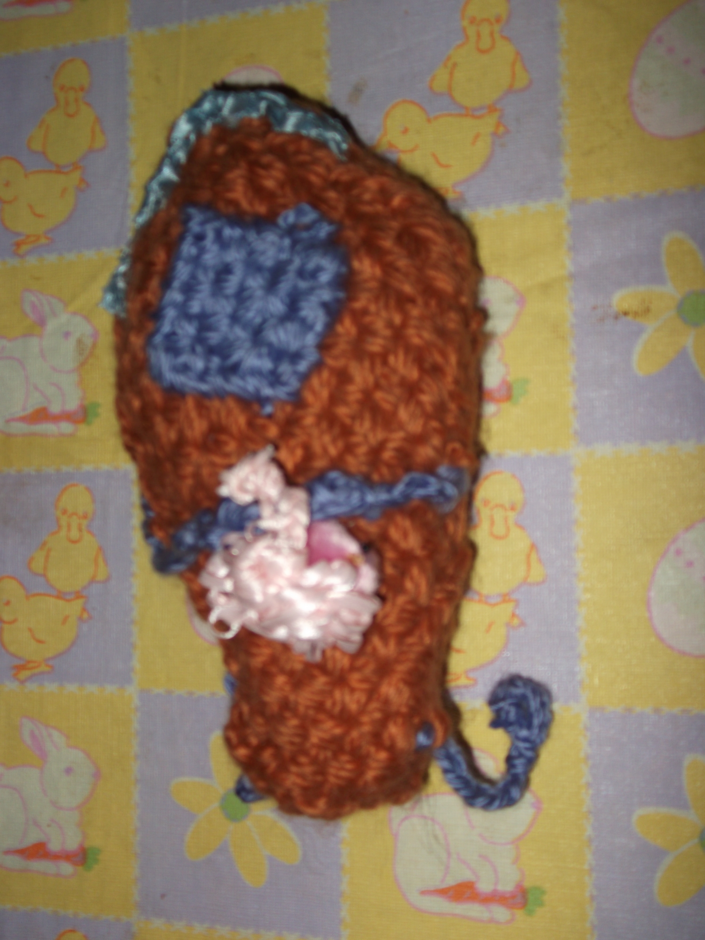 The thick basket weave texture offered a cushion. Some extra length beyond the recorder dimensions created a flap. And with some help from my needle, crochet hook, cotton yarn and a snap closure, it became the best recorder bag I’ve ever seen!
